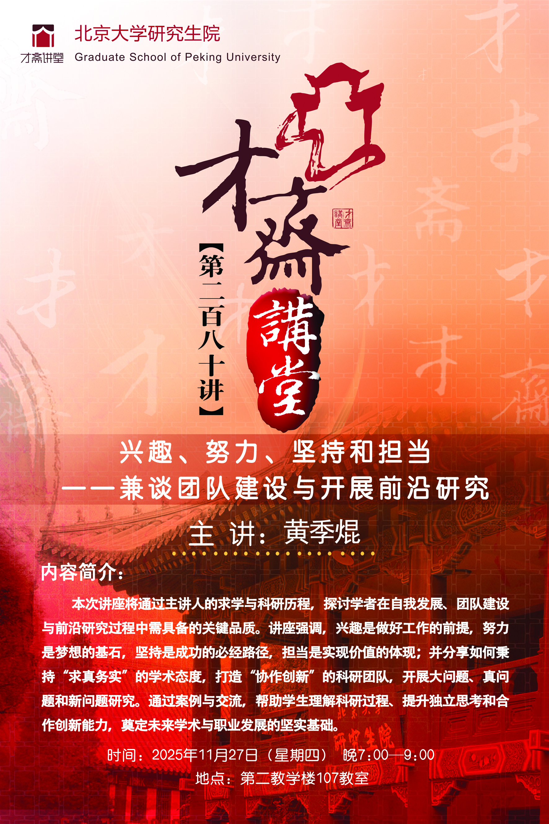 - 黄季焜主讲才斋讲堂第280讲:兴趣、努力、坚持和担当——兼谈团队建设与开展前沿研究 2025年11月27日,北京大学博雅讲席教授、现代农学院院长黄季焜做客才斋讲堂,以“兴趣、努力、坚持和担当——兼谈团队建设与开展前沿研究”为主题,结合自身求学与科研经历,深...