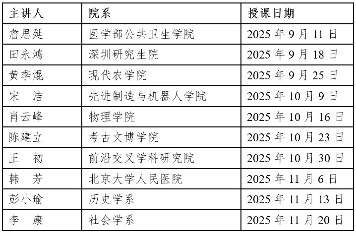 本学期共计安排讲座10讲,时间:2025年9月11日-11月20日,每周四晚7点至9点。地点:第二教学楼107教室。具体安排见下表: